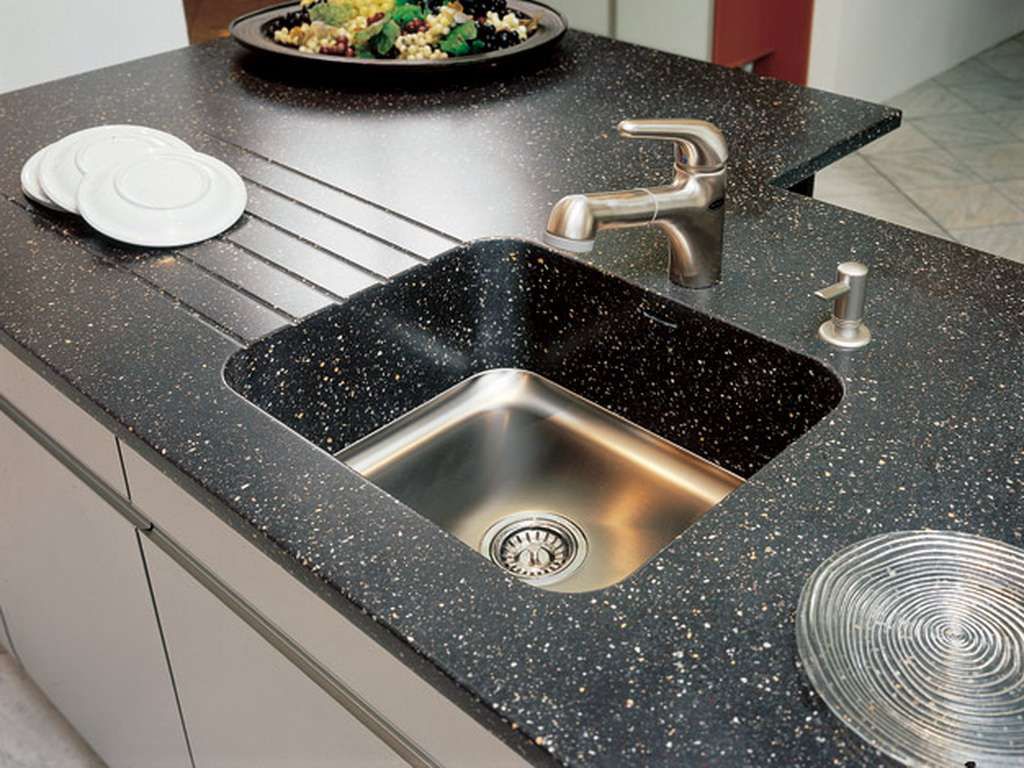 Сочетание эстетики и практичности. К важным преимуществам моек с металлическим дном можно отнести то, что они без видимых швов интегрируются с поверхностью столешницы, изготовленной из того же оттенка камня, что и боковины мойки. А в случае, если рисунок искусственного камня содержит прожилки и разводы, лучше заказать клееную мойку с металлическим дном, чтобы минимизировать риск неэстетичного "преломления" рисунка при подклейке "каменного" дна к бортам мойки.